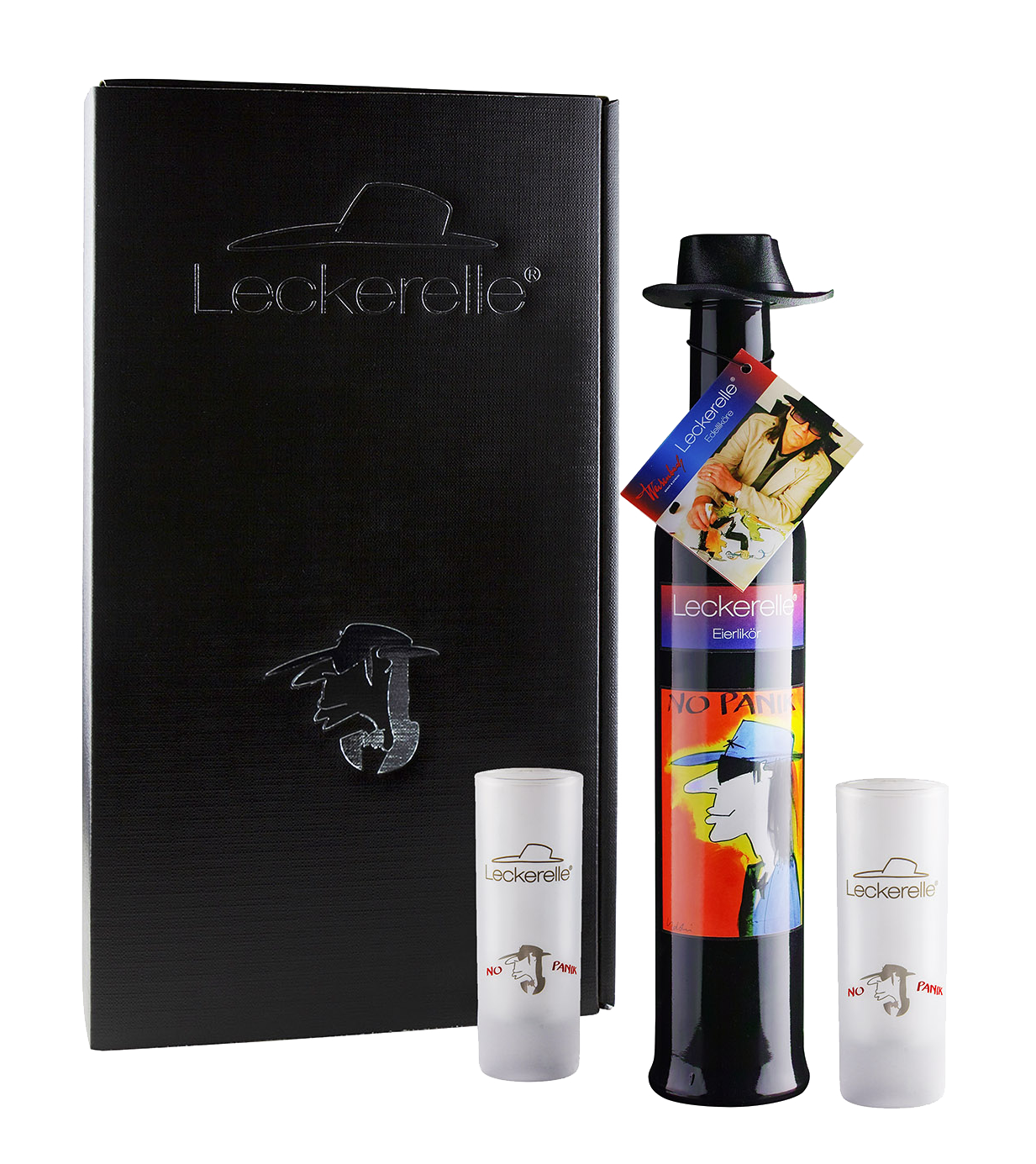 Leckerelle®-Präsentkarton (360 x 200 x 95 mm); im Deckel mit Silberfolie eingeprägt sowohl das Leckerelle-Logo, als auch ein Udo-Lindenberg-Schattenriss.